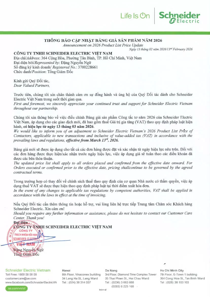 Từ 13/03/2026, toàn bộ Contactor – Khởi động từ Schneider Electric sẽ điều chỉnh tăng giá theo chính sách hãng.